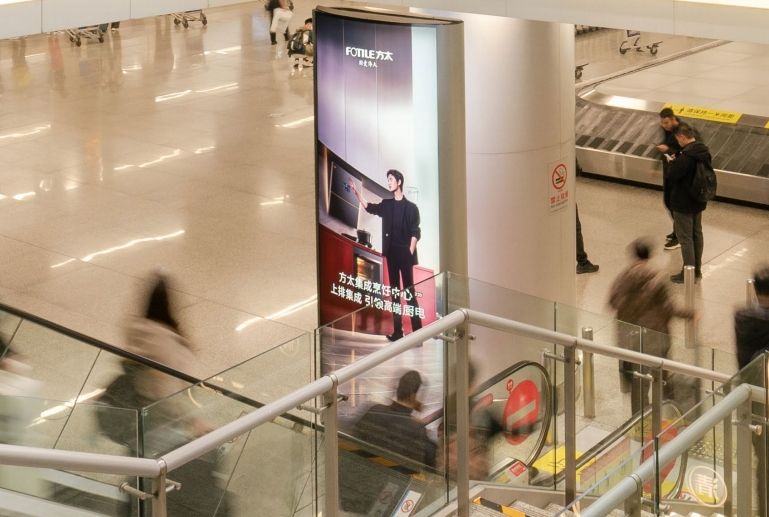 媒體位置高挑,全廳可見,周邊無其他媒體或內容遮擋,信息干擾度低,是 T1 航站樓最受矚目的媒體形式。
